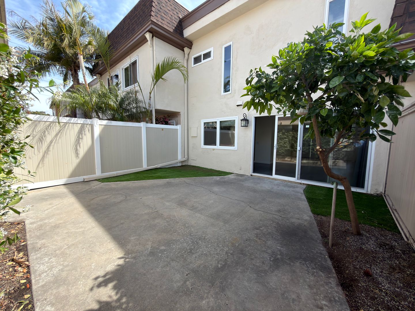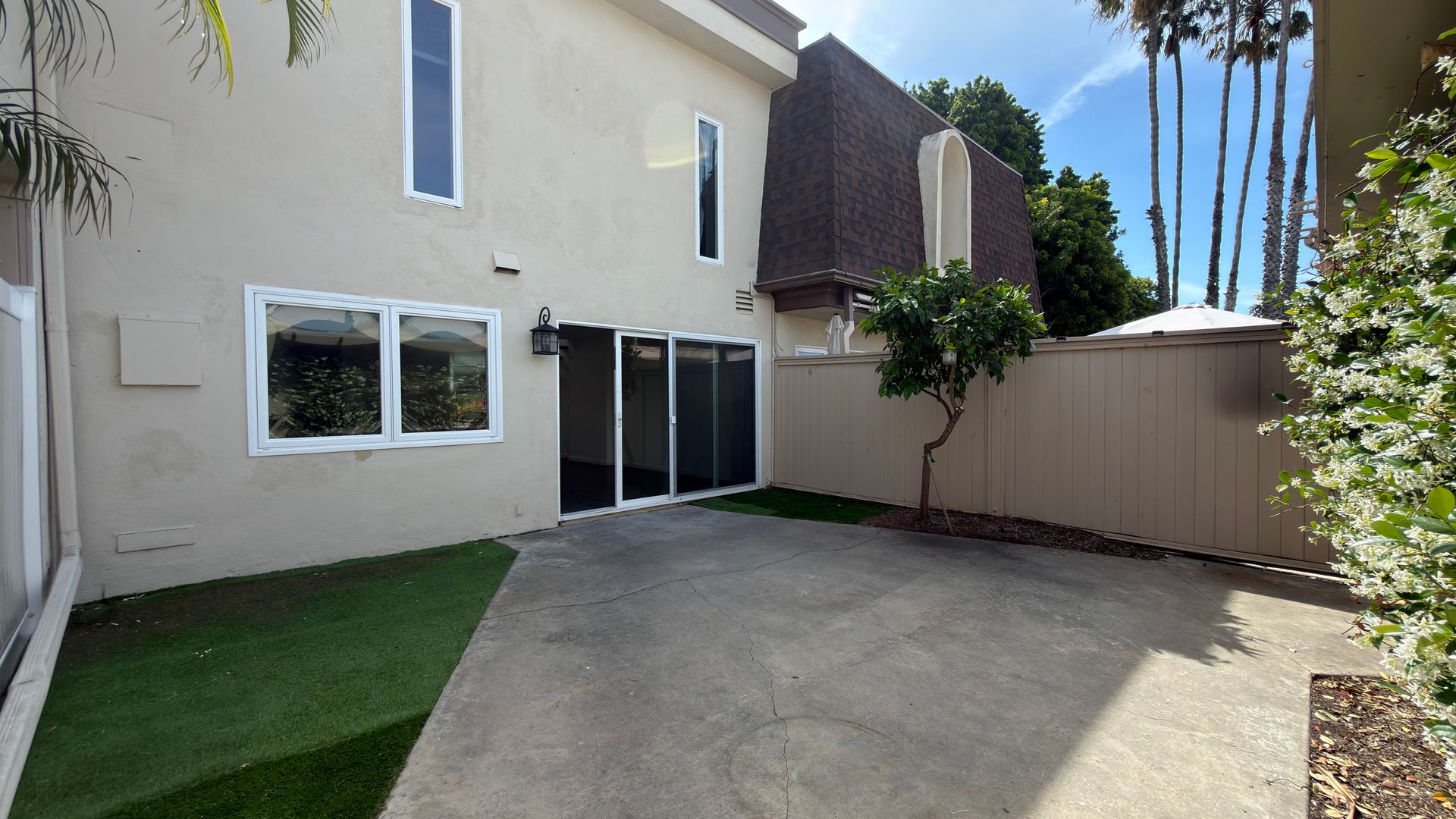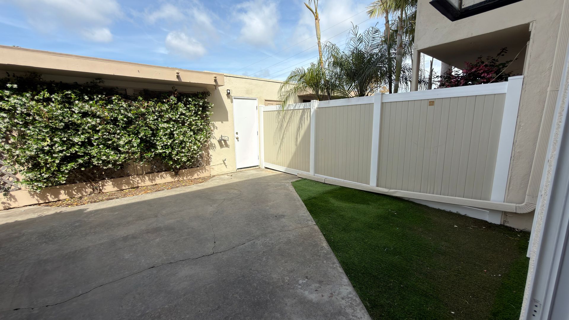 THE BACK PATIO IS AN EASY TO MAINTAIN SPACE WITH TURF AND CONCRETE AS THE FLOORING.