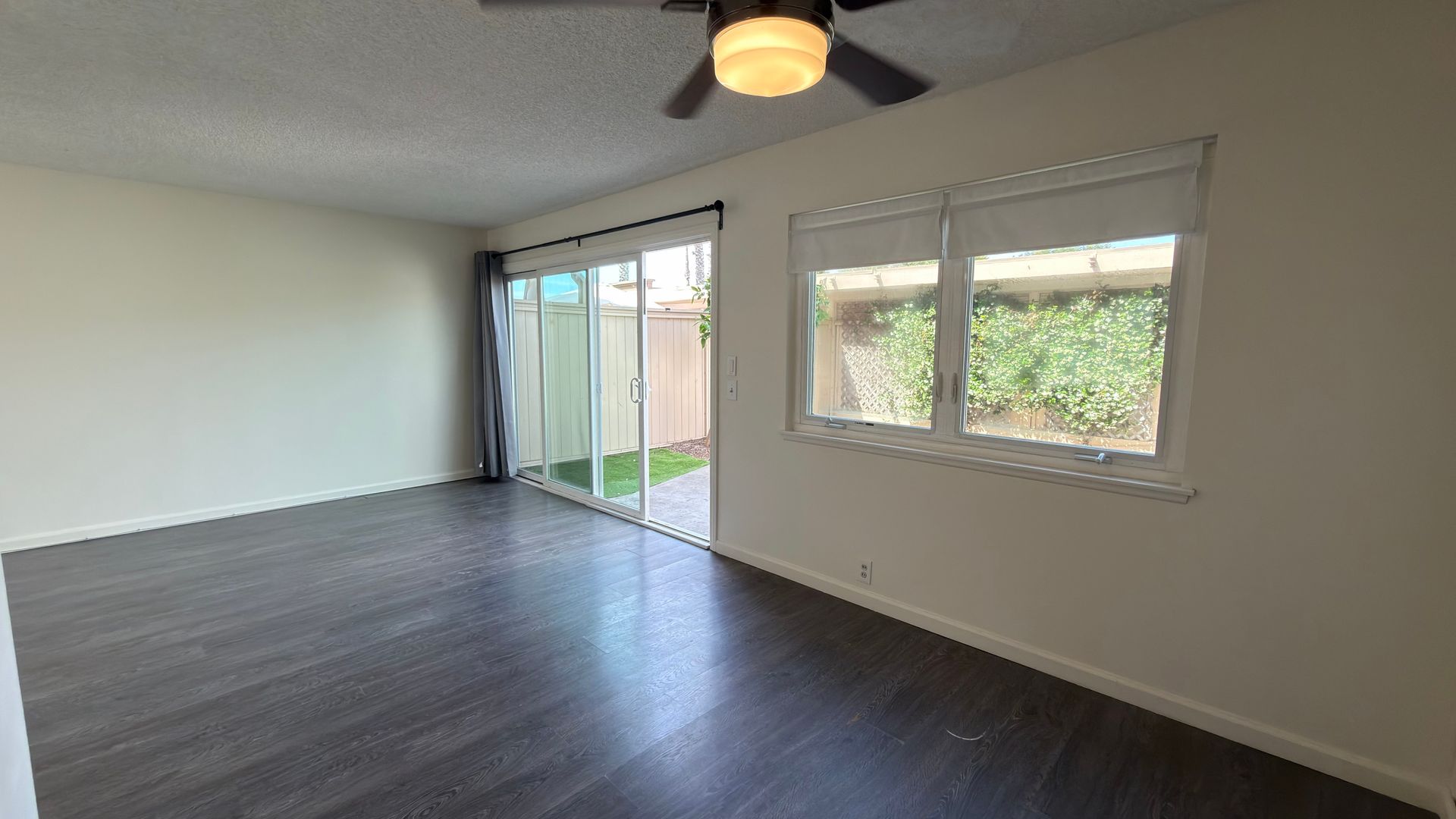 AT THE END OF THE LIVING ROOM AREA, LARGE SLIDING GLASS DOORS SHOWCASE THE PRIVATE BACK PATIO.