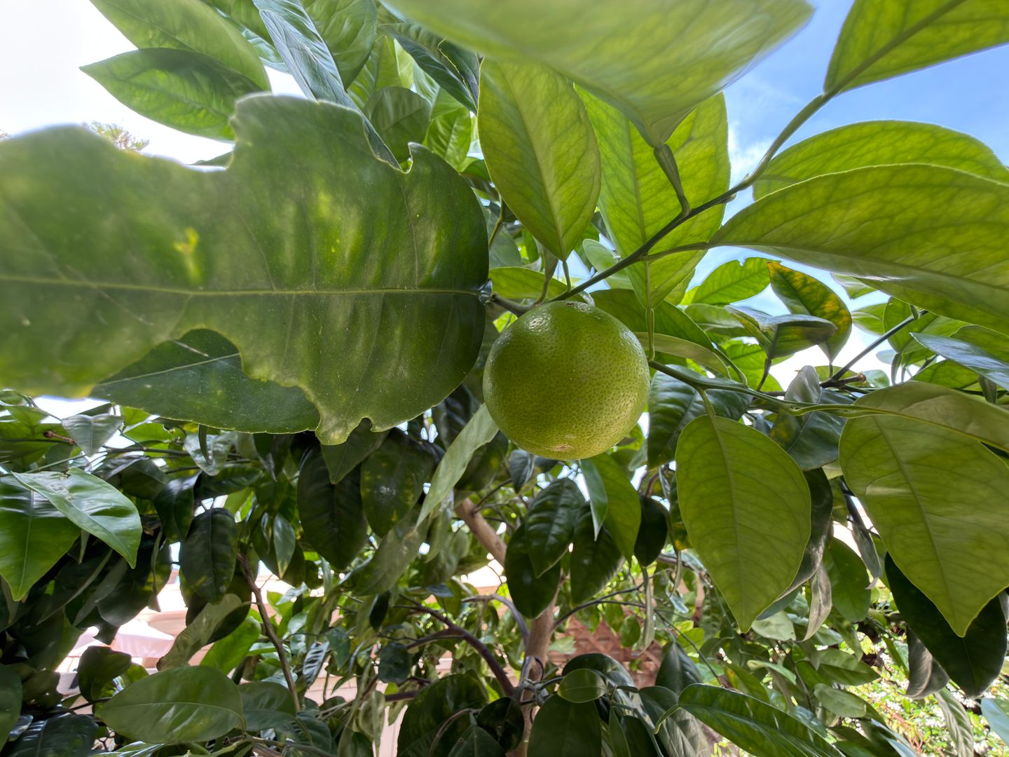 STAR JASMINE FLOWER VINES DECORATE THE REAR WALL BESIDE THE FRUIT BEARING TREE.