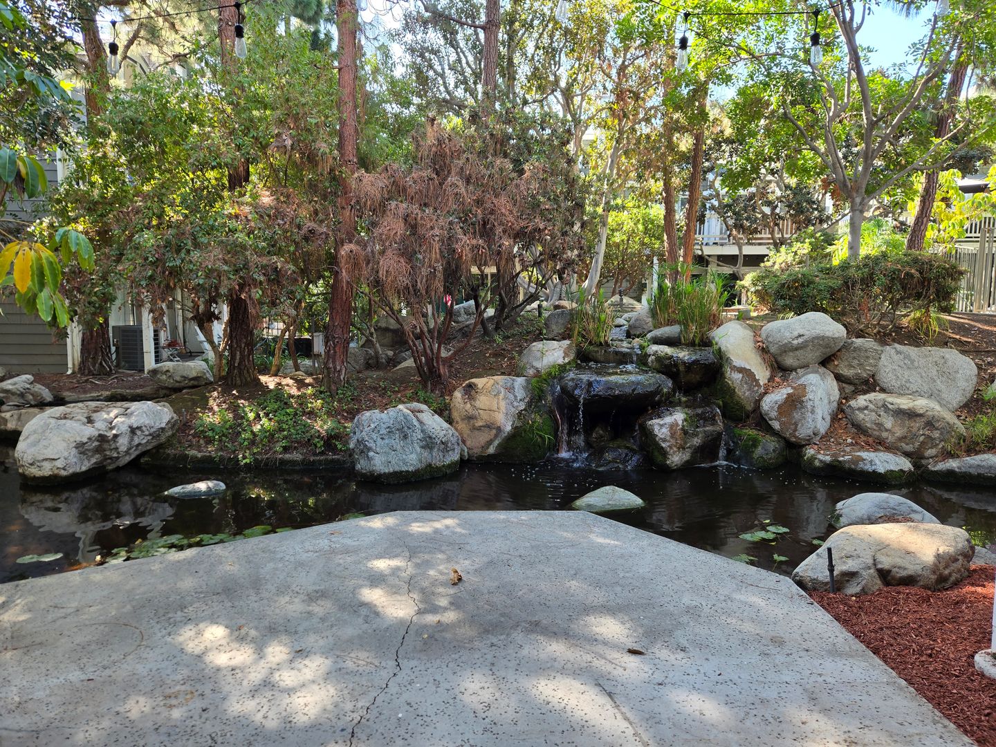 UPON ENTERING, YOU ARE MET WITH A COZY LIVING ROOM THAT BOASTS A FIREPLACE, PERFECT FOR COLDER WEATHER. ADJACENT TO THE FIREPLACE ARE GRAND, TALL WINDOWS THAT SHOWCASE THE PRIVATE SERENE CREEK AND WATER FOUNTAIN THAT IS AT THE BACK PATIO'S EDGE.